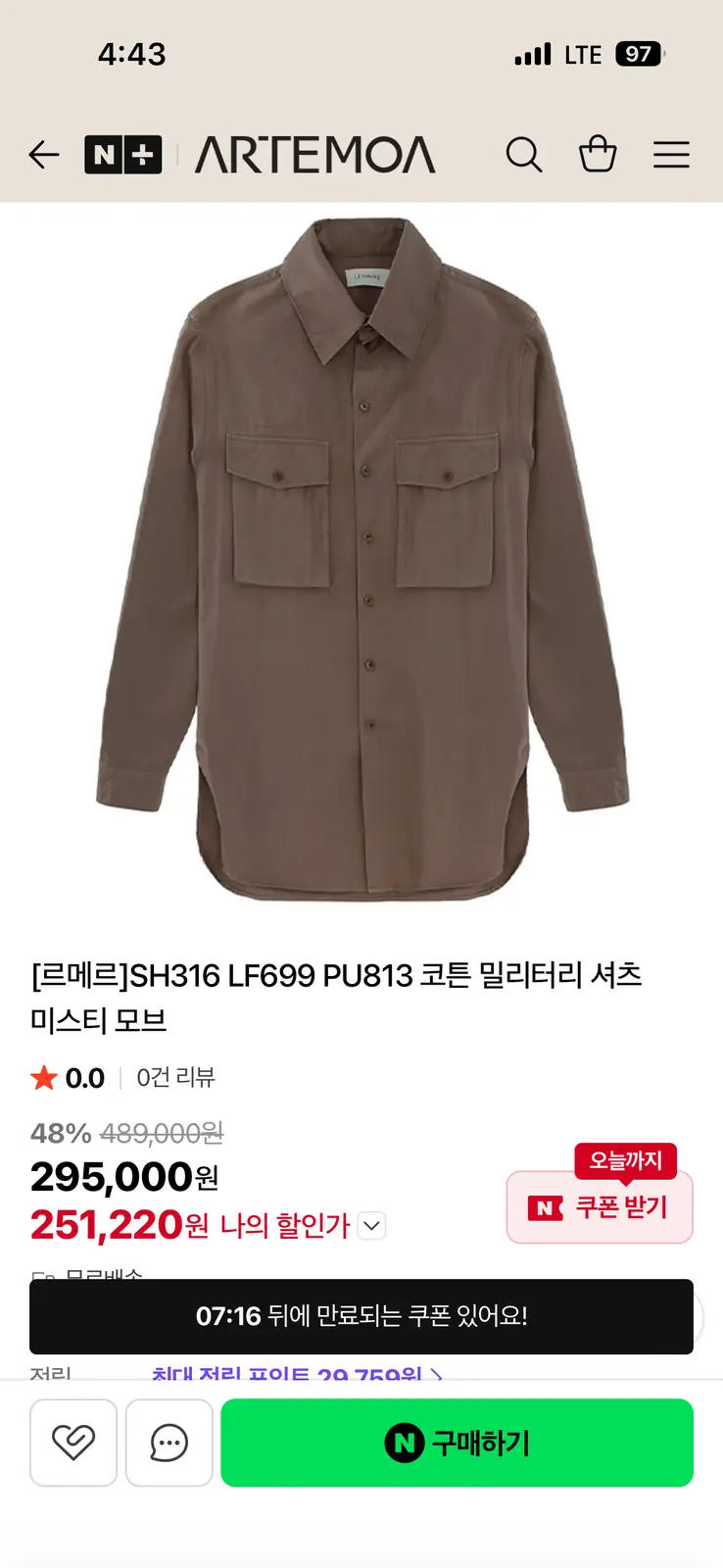 르메르 코튼 밀리터리 셔츠 미스티 모브